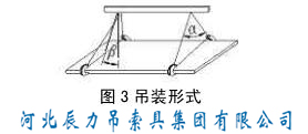 3.2  單板鉗與雙板鉗起吊鋼板時,必須與橫梁配套使用,其中α在(45-90)°之間,β在(0-15)°之間。橫梁的有效長度應不小于鋼板長的1/3。單板鉗或雙板鉗兩只試驗為額定載荷,四只為一組吊裝作業,吊運過程中,鋼板應保持水平見圖3。